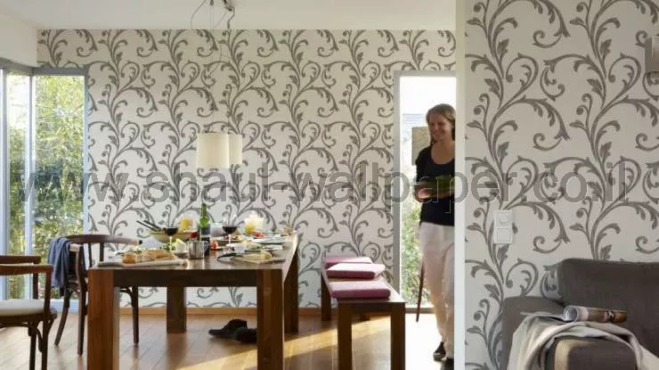 טפט לקיר עלים מיוחד נוצץ בגוון שמנת אפור