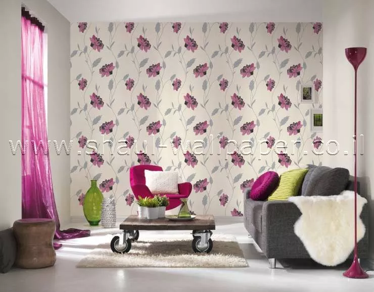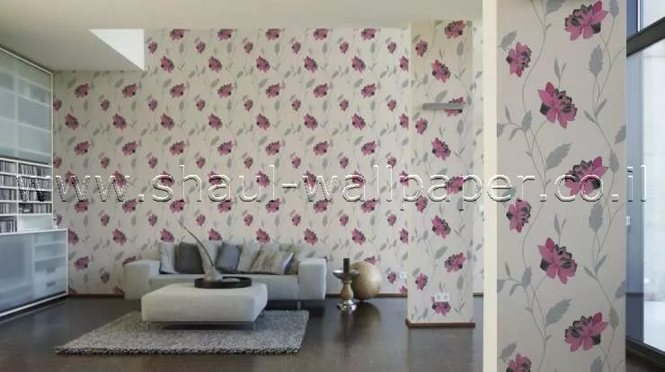 טפט פרחוני מיוחד לקיר בגוון קרם ורוד אפור איכותי מאוד מסוג ויניל.
